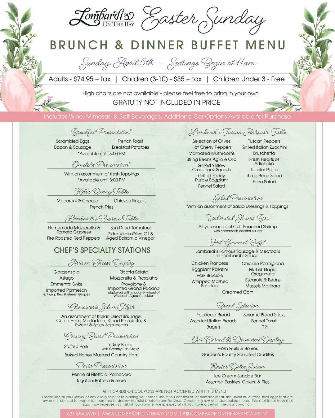 Celebrate Easter Sunday at Lombardi’s On The Bay with our Brunch & Dinner Buffet on Sunday, April 5th. Seatings begin at 11:00am, and the Easter Bunny will be stopping by during brunch for photos and family fun.